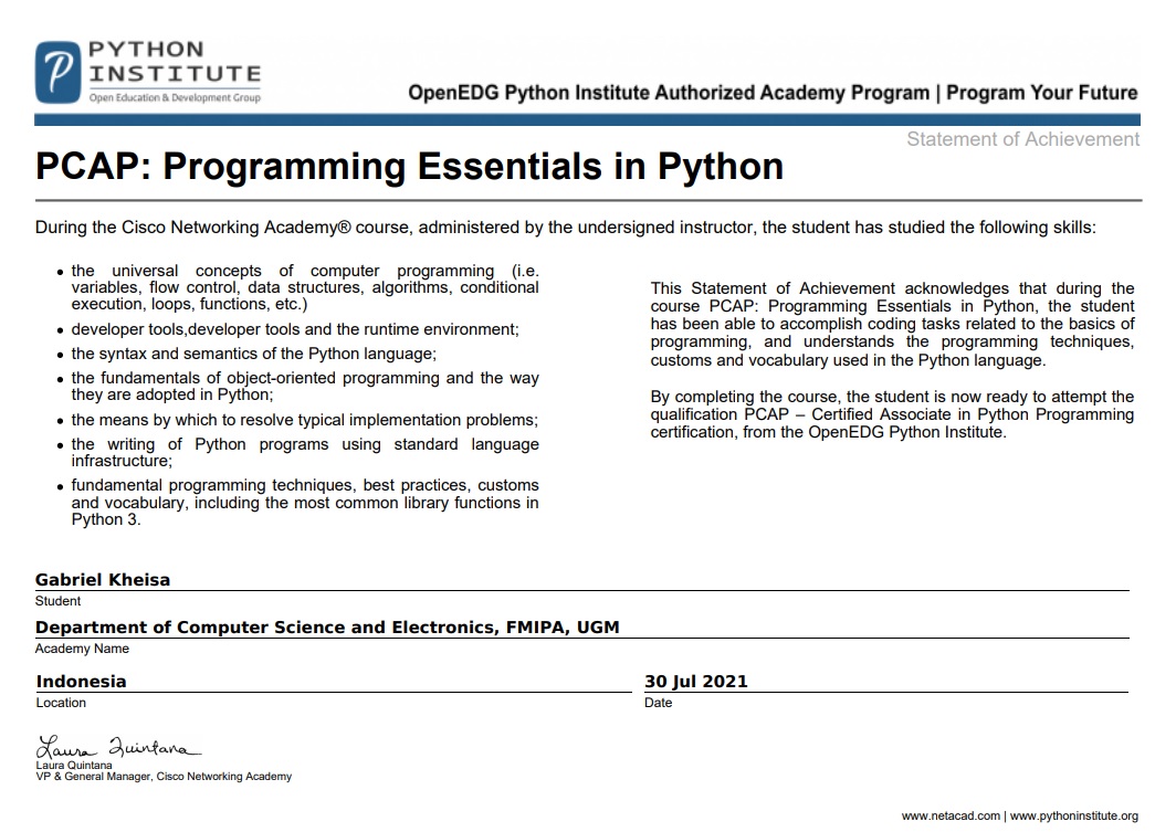 To enhance my knowledge and skills, I have obtained certifications in cloud engineering and architecting from platforms like Coursera and Dicoding. Additionally, I have achieved the Python PCAP certification to strengthen my programming skills.